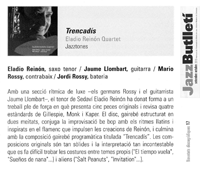 Pero caben en el disco que nos ocupa muchas más cosas, además de esa indagación tristaniana, consecuencia, quizás, del tiempo que el saxofonista pasó estudiando con Lee Konitz, y que se sustenta fundamentalmente en “Pierre”, “Inunkái Nunkái” y “Espera!!”, aunque impregna felizmente toda la grabación. Así, “Brother Angel” es un calypso que remite directamente a algunas páginas felices de Sonny Rollins; “Balmes 51” refleja (y así lo confirma Reinón en las notas de carpetilla) una clara influencia coltraniana en el fraseo y en la propia composición, influencia que podemos rastrear también, aunque más diluida, en “Nana Per La Maria”; “Carromato” es una brillante rearmonización de “Caravan” arreglada a modo de bulería, con la complicidad de un Miralta que luce con desparpajo y acierto sus armas flamencas; “Inunkái” y “Espera!!” sirven al saxofonista para homenajear a otro de sus referentes: Wayne Shorter; “Dintre I Fora” cierra el disco con un hermoso solo de tenor basado en “I Remember April”.